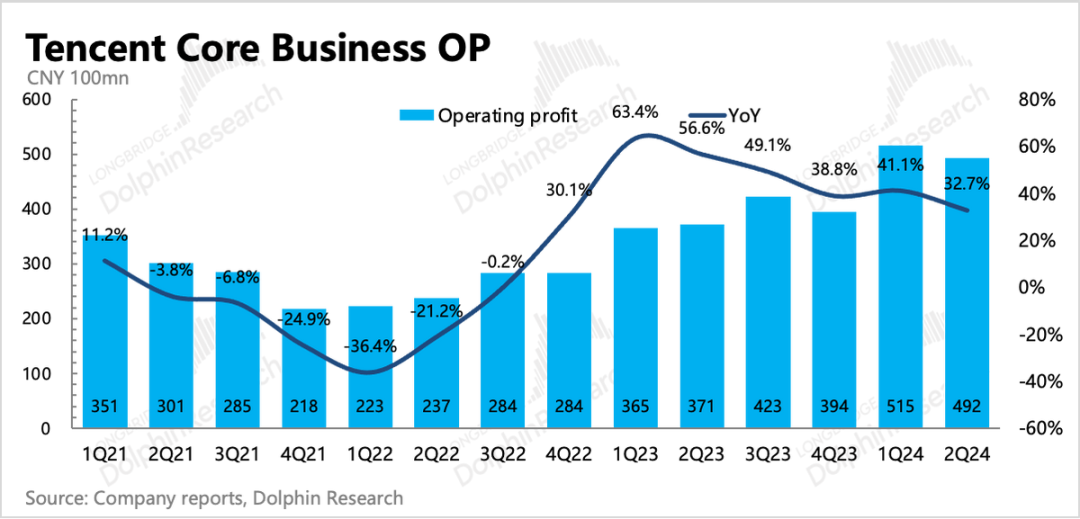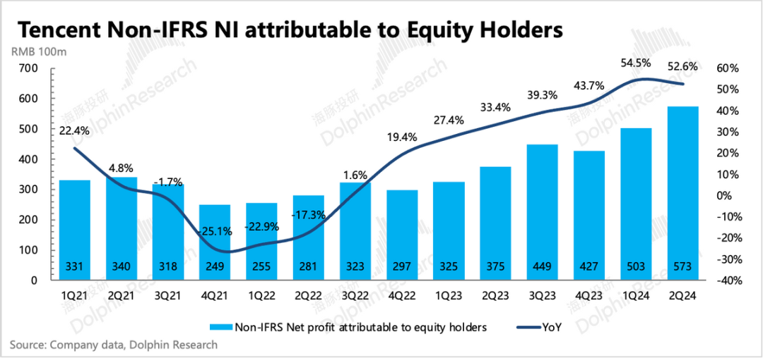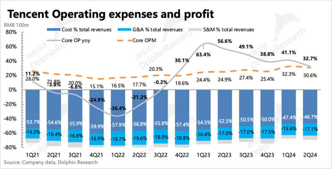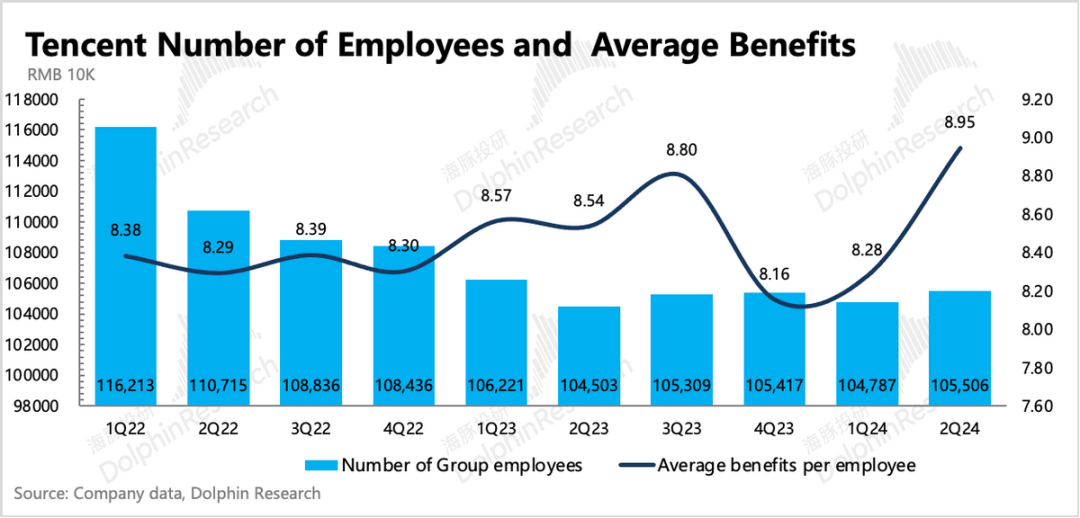 由于自身资源复用、业务结构变化(视频号广告、小程序游戏)带来的毛利率提升逻辑,已经持续讲了一年多,Q2延续改善趋势。但经营费用上,销售费用因为重磅新游戏上线而正常增加外,研发投入或因为游戏、AI相关产品或技术的开发而回归增长。具体表现为研发人员薪酬增长6%(集团雇员人数环比净增719人),以及带宽服务器费用增长17%。最终海豚君一贯比较关注的主业经营利润(不包含其他非经营相关收益)同比增长33%,利润率环比下降了2pct,只是符合预期。而因为有效税费的变化(计算得综合税率同比下降12pct,系海外附属公司递延所得税调整),使得最终Non-IFRS归母净利润同比增长53%,看似超出预期。虽然二季度提效趋势再次被打破,但海豚君仍然认为中长期下,腾讯还有经营提效潜力。一方面当下员工规模的绝对体量庞大,相对当前成熟的商业模式仍显臃肿;其次AI等新技术短期需要投入,但中长期对企业的内部效率优化会有更多的帮助。Q2员工新增,并不代表腾讯迈入了新投入周期,考虑到社会影响和短期经营变化,滚动式小步优化仍然是股王战略方向。