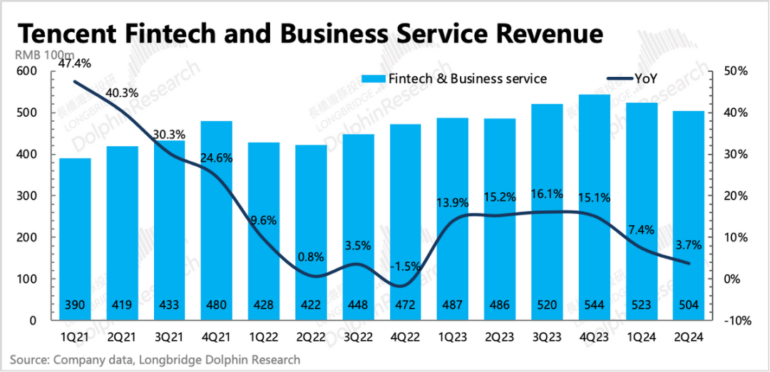 二季度金科企服同比增长3.7%,低于市场预期,这也是三大业务中最能体现宏观beta的板块。主要是因为收入占比70%为支付业务,而腾讯近期并未在支付上有新的可以带来增量的动作。宏观压力下,线下支付进一步放缓。这不仅是体现在微信支付上,二季度整体社零表现很一般,再加上去年疫情刚结束需求释放带来的高基数,央行披露的第三方支付机构备付金直接同比下滑了。因此二季度的增量还是在视频号佣金和云服务(企业微信商业化)。剔除视频号佣金收入的15亿后(海豚君预测值),隐含云服务也仍然有高个位数的增长。