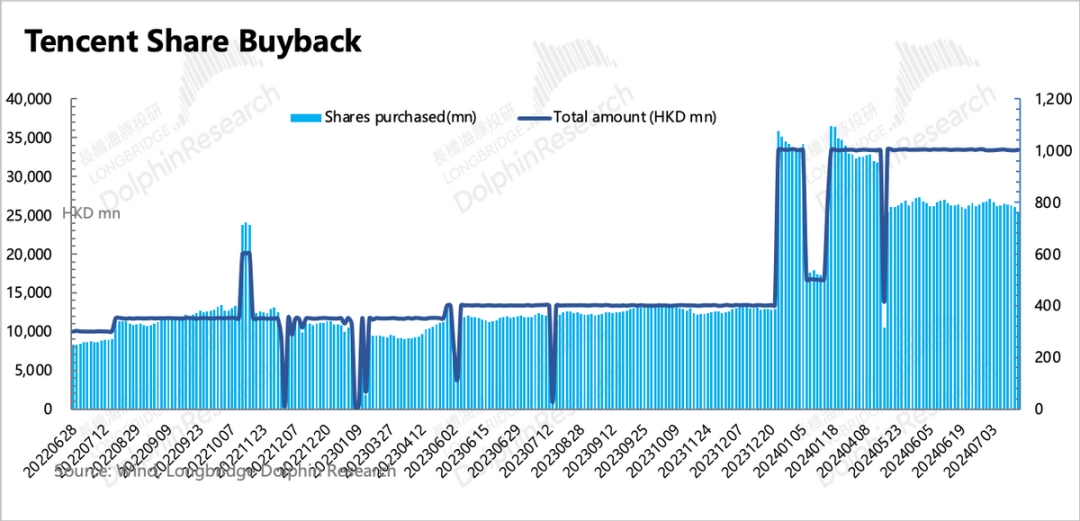 从回购量来看,腾讯继续加大回购,环比增长250%:二季度回购了1.55亿股,耗用523亿港元,购回的股份已被注销,总股份环比1Q24减少0.4%。