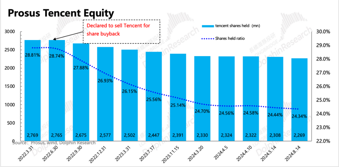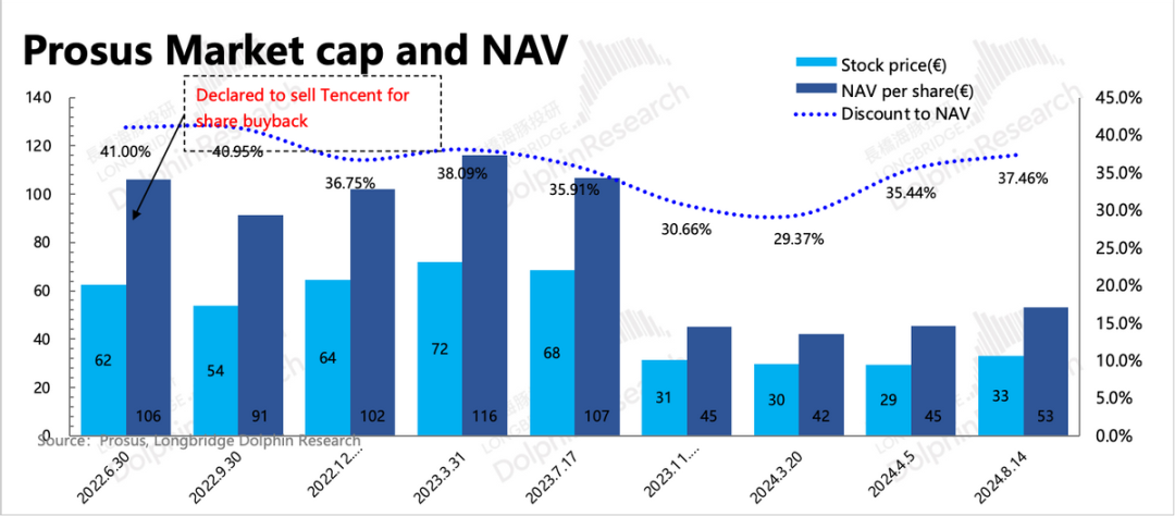 相比我们在5月的统计,大股东Prosus 在5月14日至今3个月内抛售了3970万股,相比上个周期平均月抛售节奏(1250万股/月)略有加速。但因为腾讯回购注销力度更大(4000万/月),截至二季度末,大股东持股比例变化不大,仍有24.34%,其净资产/股价=62.53%,也就是折现率为37.46%,二季度以来有一定提升。