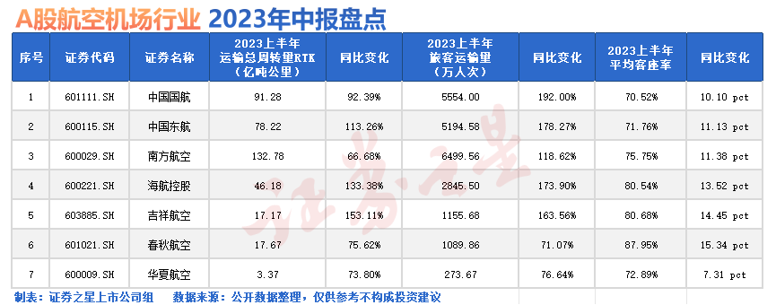 具体来看,2023年上半年,七大航司的经营数据同比均出现大幅好转。