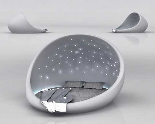 The Cosmos Bed由白色玻璃纤维制成,形状酷似鸡蛋和太空舱,内置床垫可根据需要调节倾斜度。其特别之处在于,采用了柔和的LED照明系统模拟星光效果,配合宁静的音乐及户外特有的气味,让你在舒适放松的感觉下进入甜美梦乡。The Cosmos Bed还自带闹铃设备,就算到了该起床的时间,也不用担心睡过头。