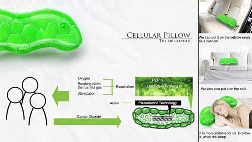 “细胞枕头”实际上是一个空气净化系统,当我们睡着时,它能净化我们周围的空气。这样即使我们在睡觉,也能呼吸到清晰的空气,如同置身于深林中。相信在这样的环境中睡觉,睡眠质量一定能够得到保证。高科技“细胞枕头”由多个带有芦荟细胞的“细胞容器”组成,能够清除细菌,产生氧气,让使用者边睡边呼吸新鲜空气,醒来后精神饱满、倍感轻松。