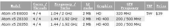 全新的凌动x5-E8000系列包括Atom x5 E8000、 x5 Z8330以及x5 Z8350三个型号,均基于Intel Braswell架构,其中定位相对最低的E8000的热设计功耗仅为5W,售价39美元,比绝大多数基于Braswell架构的赛扬和奔腾处理器要便宜很多。