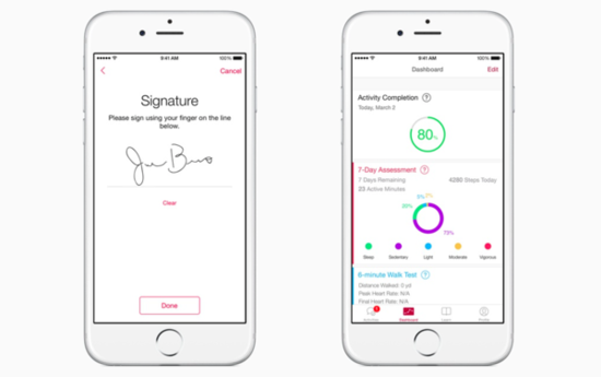 今年 3 月,苹果再接再厉又推出 ResearchKit 开发工具,一个打通医生和用户群体的更为便捷的医学研究工具。有了 ResearchKit,医疗工作者可以更加轻松地针对 iOS 设备打造各式各样的医疗 App,并且充分利用 iPhone 的加速感应器、气压计和陀螺仪等传感器来收集海量医学数据。经用户许可,ResearchKit 亦可无缝接入一个由 HealthKit 生成的实用数据库,其中包含每日步数、消耗的卡路里和心率等信息,以供医学研究人员使用。