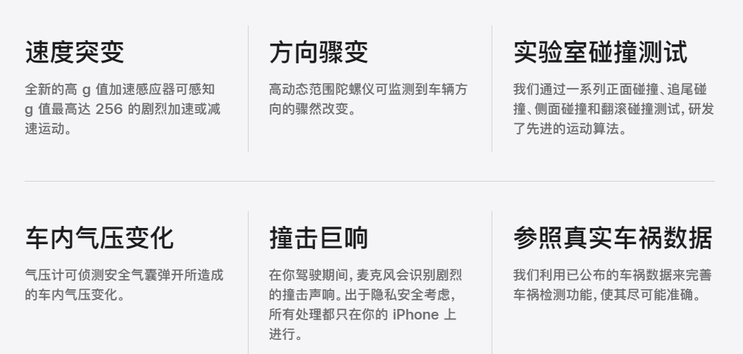 日前,苹果在最新发布的新机上推出了“车祸检测功能”,宣传称“iPhone会听、会感知、会测算是否发生了车祸。”“100万小时的真实驾驶和车祸数据帮助iPhone识别车祸事故”。这一功能的最大作用在于检测车祸发生后“主动替你打求救电话”。