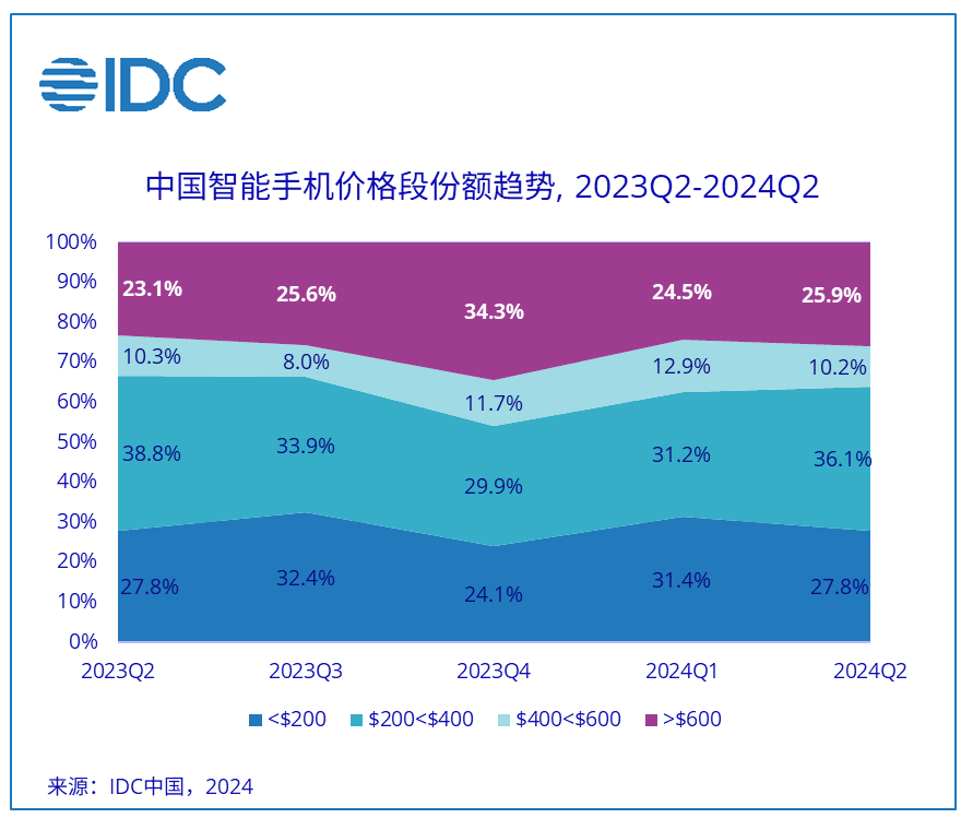 特别值得一提的是,高端手机市场(600美元以上)在中国持续增长,市场份额达到了25.9%,同比增长了2.8个百分点。