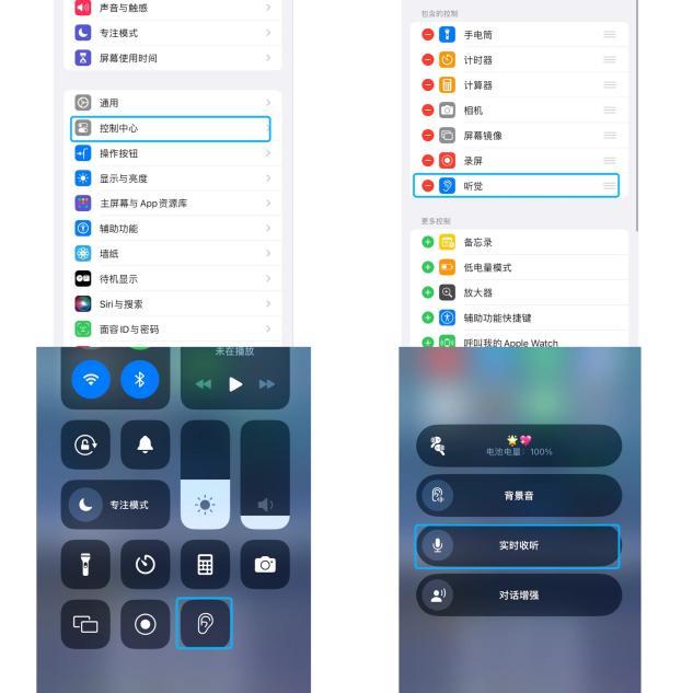 用户成功连接AirPods后,在iPhone上打开控制中心,将听觉功能加入主页,并点击“耳朵”图标,然后选择“实时收听”,将手机放在想要窃听的人旁边,拿着AirPods躲到角落,就可以实现“隔墙有耳”了。