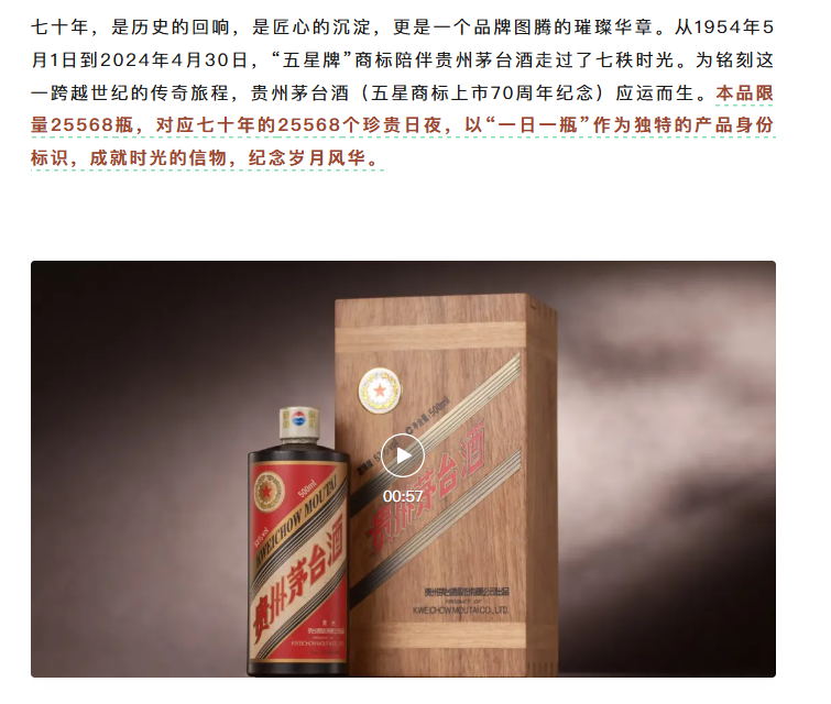 8月8日,茅台推出的新品“贵州茅台酒(五星商标上市70周年纪念)”在i茅台App上正式开售。据了解,该新品每一瓶均印刻专属身份编码,定价为7000元/瓶,限量25568瓶。