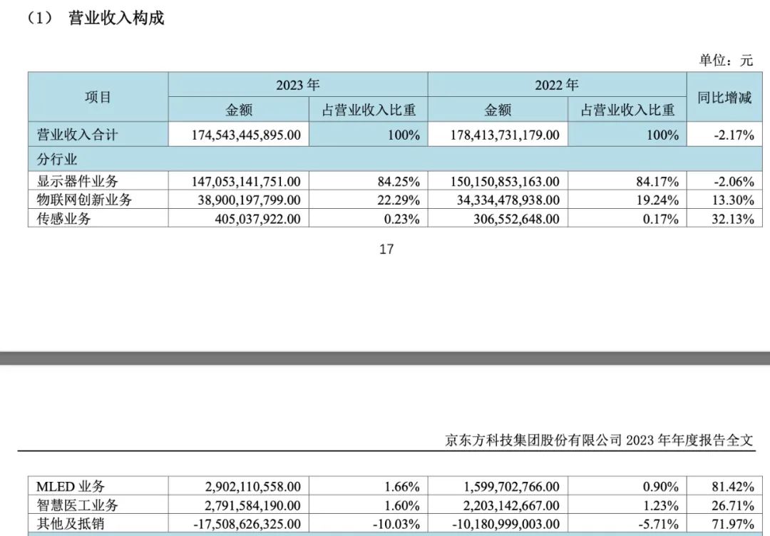 具体来看,显示器件业务营收1470.53亿元,同比下降2.06%。但物联网业务营收占比提升到22.29%,营收规模达到389亿元,同比增长13.3%;传感业务、MLED、智慧医供业务则高速增长。