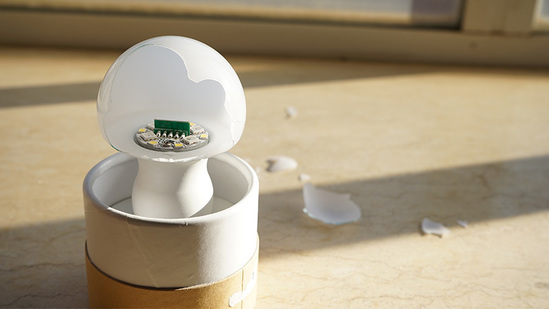 灯泡的主体和罩壳都是塑料材质,罩壳非常易碎。这次试用里,蘑菇灯泡从6cm高的地方落到石质台面上,罩壳就碎了小半边。但因为罩壳塑料的质地,碎口并不锋利,而LED发光元件没受到任何损伤,所以灯泡的继续使用是完全没问题的。