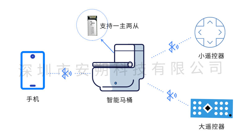1、智能马桶使用ANS-BT102M低功耗蓝牙模组,支持一主两从功能,与马桶主控串口通信;