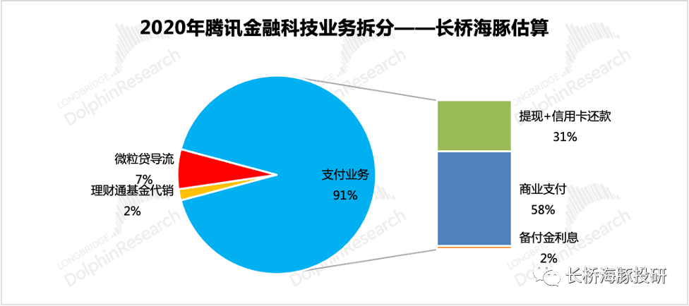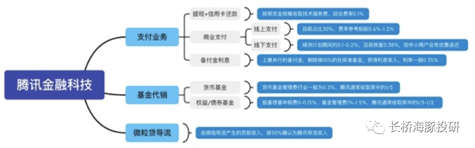 (1)支付收入。包含个人提现、信用卡还款、商业支付,以及央行划拨的备付金利息。为腾讯金科业务主要收入来源。
