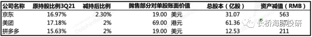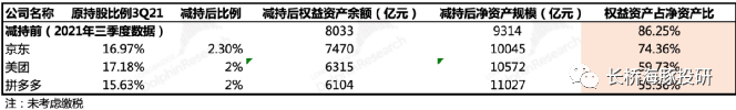 结合<1-2>,海豚君在按照2021年三季报披露的资产数据,算下来如果依次减持京东、美团、拼多多后,对应的权益资产占净资产比重分别为: