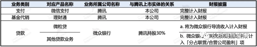 从上表可以看出,腾讯与阿里蚂蚁一个明显区别是,处于监管风口浪尖上的现金贷业务,实际上是位于腾讯上市实体报表之外的。因此财报中,拆分金融科技收入,主要为: