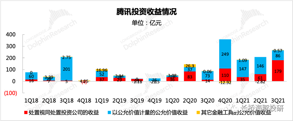 股权资产庞大,一方面是腾讯投资出手频繁,另一方面,从历史情况上来看(尤其是2018年-2020年期间),在旗下投资资产接连增值或上市导致整体投资类资产规模大幅扩张时,腾讯却基本很少做大规模的主动处置,更多的是“被动”的视同处置收益(如联营公司上市公允价值发生重大变化确认的收益、进一步收购联营公司直至控制并表而确认的收益)。