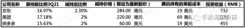 c.投资收益结果。按照上面确定的抛售价和最新持有成本,京东、美团、拼多多被减持后的投资收益如下(假设腾讯对美团、拼多多的持股比例减持到2%)