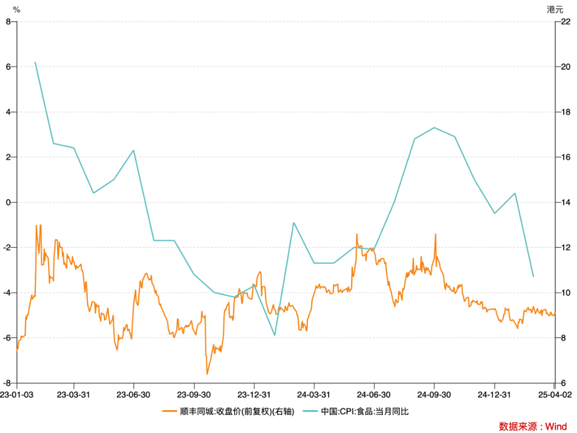 只是顺丰同城差了点“运气”,2023年之后我国宏观经济出现了较为严峻的下行压力,尤其在2024年中之后CPI成为经济学界最为揪心的指标(CPI同步不振意味着终端有效需求不足)。在上图中我们可以非常清晰看到,与我国食品类CPI同比增长与顺丰同城股价的下行几乎又保持同一节奏,显然大环境的不佳已经影响了市场对企业未来的信心,股价因此承压。