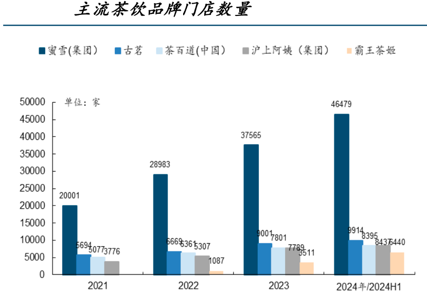 上图为代表茶饮企业的门店数量情况,2024年各大品牌都进入明显的扩张周期,其中霸王茶姬半年时间增长更是接近1倍,着实令人惊叹。