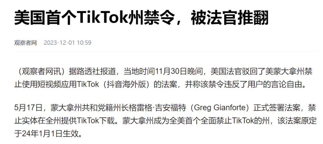 不过,当年11月30日,美国法院驳回蒙大拿州全面禁止TikTok禁令。彼时,美国一名联邦法官裁定,蒙大拿州禁止使用短视频应用程序TikTok的法案违反了用户的言论自由权,因此无效。这也是美国首个全面禁止TikTok的州所遭遇的一次重大挫折。