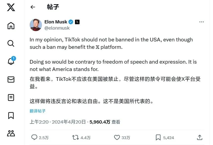而就在美国国会众议院就跳动公司旗下短视频应用TikTok“不卖就禁”法案最终表决日(4月20日)前夕,社交平台“X”(原推特)拥有者埃隆·马斯克就公开发文,对美国禁止TikTok表示反对。