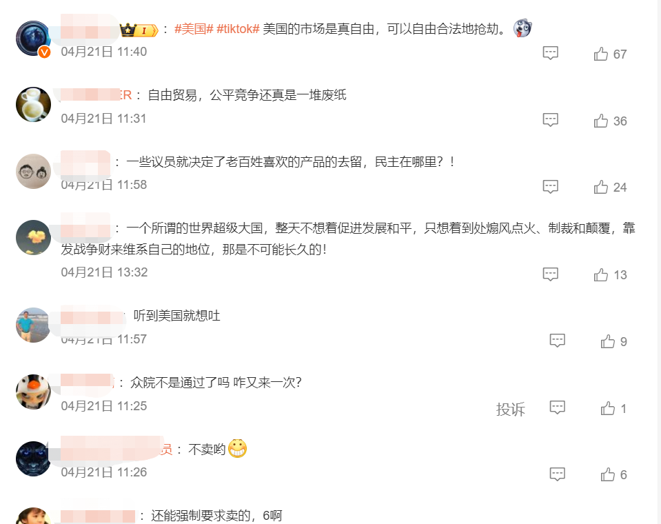 除了海外知名人物、普通的网友为TikTok鸣不平外,国内网友对于美国强制要求字节跳动“卖掉”Tiktok,也是义愤填膺。而在微博评论区,各种痛骂美国作为世界上的超级大国,不干正经事,拿着“强盗逻辑”公开打劫的帖子随处可见。