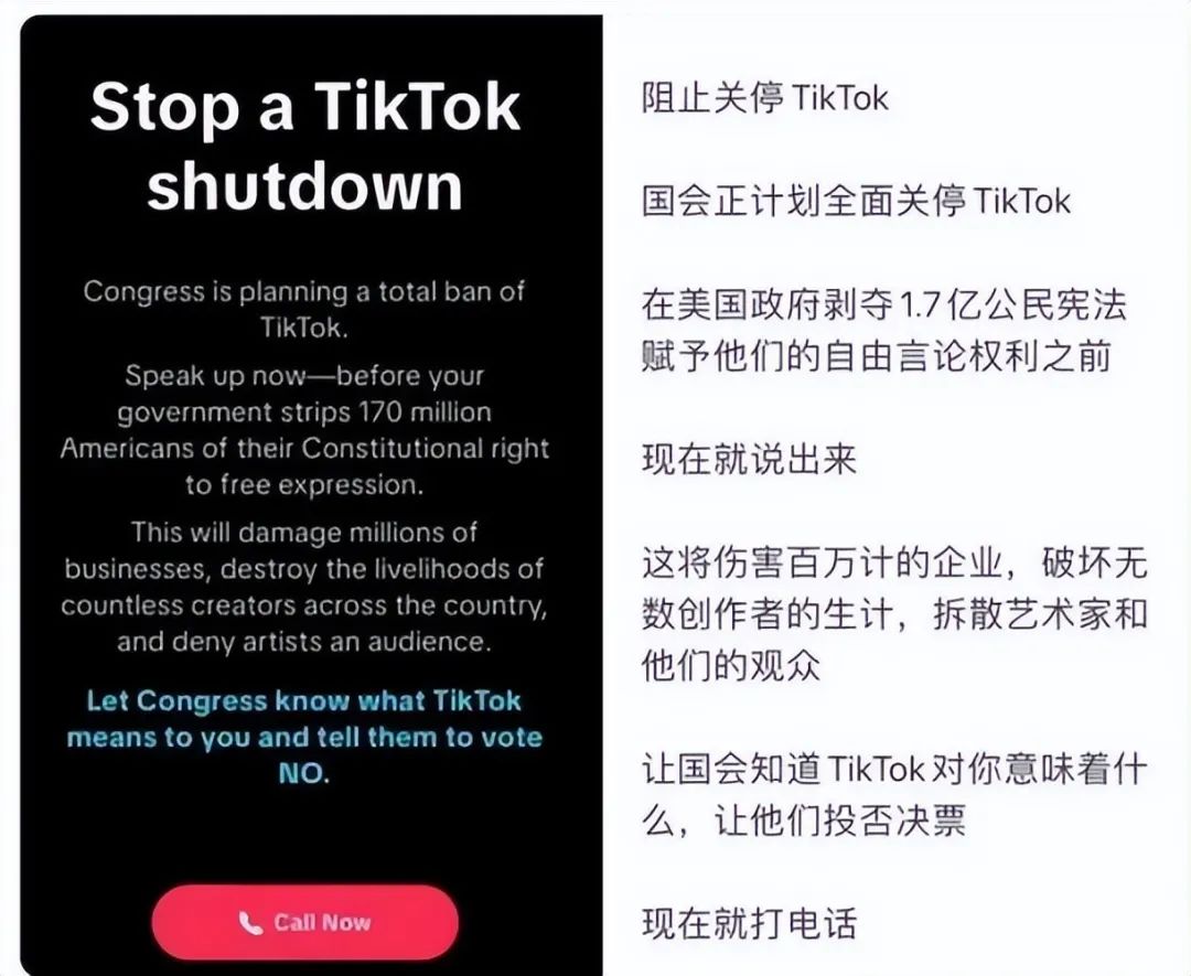 此外,3月7日,在众议院能源和商业委员会以50票赞成、0票反对的投票结果通过了字节跳动出售TiKToK这项法案,并提交给全院大会进行审议后,TikTok也迅速采取了反击措施:向超过1.7亿的美国用户推送弹窗信息,引导他们给国会议员致电,要求撤销关停TikTok的议案。