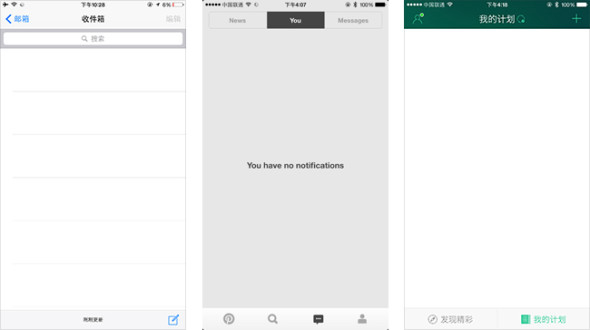 缺省页面,是出现在用户没有提交任何资料或者网络连接不通畅的情况下所展现的页面。通常设计师们习惯用丰富的数据内容把页面设计得美观实 用,考虑的都是界面展现的“理想状态”,往往会忽视没有内容的“缺省状态”。未经过精心设计的缺省页面降低了用户的使用体验,并可能给用户带来困扰,如下 图iOS系统邮件App,无邮件时界面上没有任何有效反馈信息,用户不能明确得知到底是网络问题还是账号同步出错亦或者是收件箱内确实一封邮件都没有。同 样的情况也出现在Pinterest和出发吧的界面里。