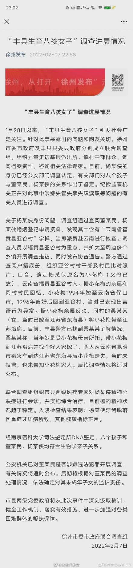 2月7日,第三次通报——杨某侠的身份经公安部门调查认定,原名为小花梅(父母已故),云南省福贡县亚谷村人,其父母委托同村人带至江苏治病后走失。