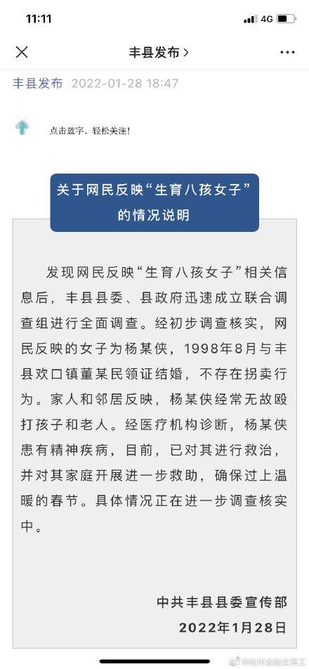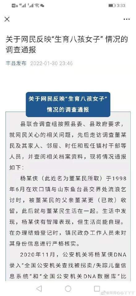 1月28日,第一次通报的初步调查结果——该女子名叫杨某侠,1998年领证结婚,不存在拐卖行为,患有精神疾病。