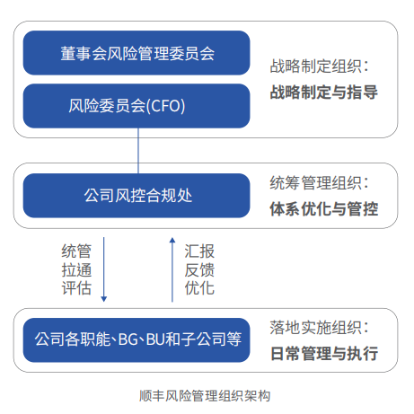 为促进公司可持续健康发展,顺丰控股构建了完善的内控与风险管理体系,加强和规范公司内部管理,不断提高风险预防及管控效果,针对运营及发展过程中存在的环境、社会及管治(ESG)风险,公司亦积极进行识别与评估,明确应对策略,切实降低企业经营风险。为此,顺丰控股搭建了由董事会风险管理委员会领导的风险管理架构,并董事会风险管理委员会下设风险委员会作为公司风险统筹管控的专业决策机构,由公司首席财务官领导。