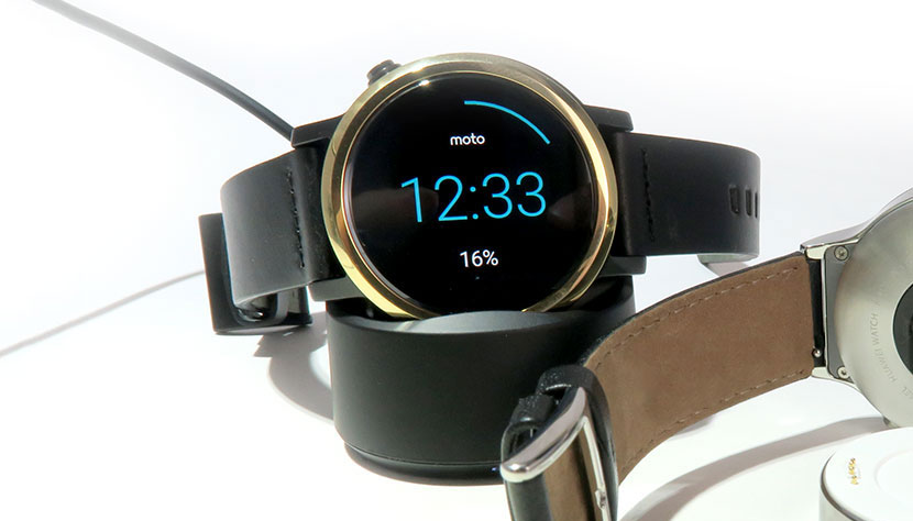 由于Moto 360(2015)新增加了一个“小耳朵”,因此想要平放Moto 360(2015)就不太可能了;这时候,将Moto 360(2015)放置在它的充电基站上会让它进入充电循环状态,也就是说手表能够检测到充电器。