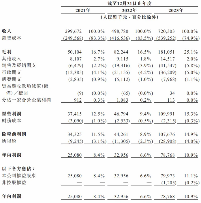 从业绩表现来看,新吉奥房车正处于稳定增长期。招股书显示,2021-2023年,公司实现收入分别约为人民币3亿元、4.99亿元、7.2亿元,年复合增长率为55.04%;净利润分别约为人民币0.25亿元、0.33亿元、0.79亿元,年复合增长率为77.22%;毛利分别约为人民币0.5亿元、0.82亿元、1.81亿元,年复合增长率为90.09%。