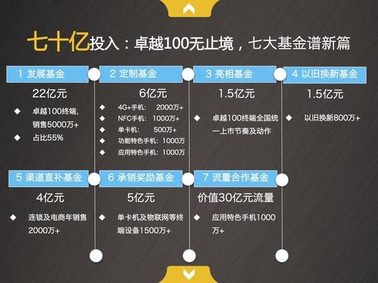 具体计划如下:1、22亿元发展基金,用于卓越100终端的销售激励;2、6亿元定制基金,用于4G+、NFC、单卡、加密、对讲手机等定制机的激励;3、1.5亿元亮相基金,用于卓越100终端在全国范围内的统一上市;4、1.5亿元以旧换新基金;5、4亿元渠道直补基金;6、5亿元承销奖励基金;7、价值30亿元的流量合作基金,主要用于应用特色手机。