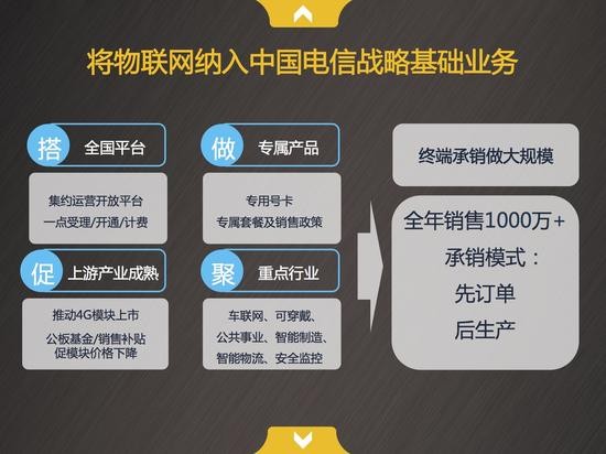 而在物联网的终端方面,中国电信表示将通过先发订单后后生产的承销模式来做大产业,力争2016年全年销售1000万台以上的物联网终端。