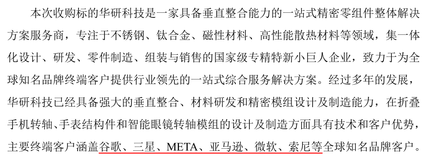 根据裕同官方公告,华研的主要终端客户涵盖谷歌、三星、META、亚马逊、微软、索尼等全球知名品牌。据供应链消息,全球出货量最大的智能眼镜品牌M,其铰链疑由华研供货。
