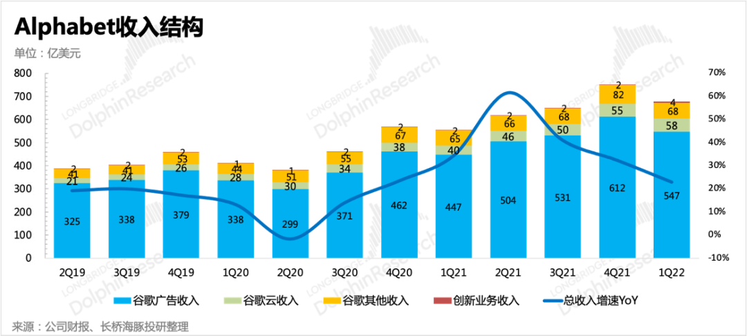 首先纵观 Alphabet 的整体业绩。一季度公司实现总营收 680 亿,同比增长 23%,基本符合市场预期。