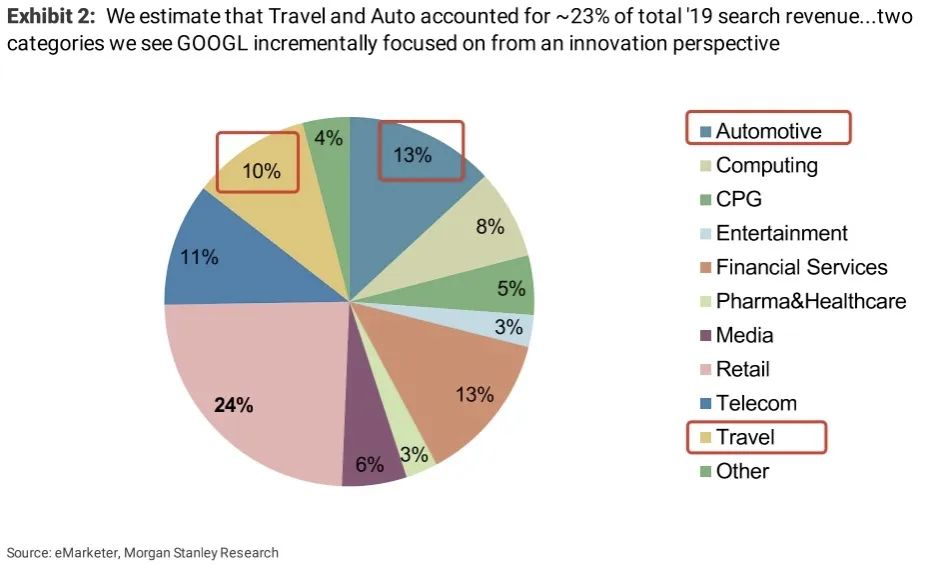 1)虽然去年大放异彩的零售类广告,今年大概率要偃旗息鼓,但旅游、汽车广告在谷歌的搜索广告上也体现了强劲的修复和增长趋势,能够缓冲一些零售广告的影响。