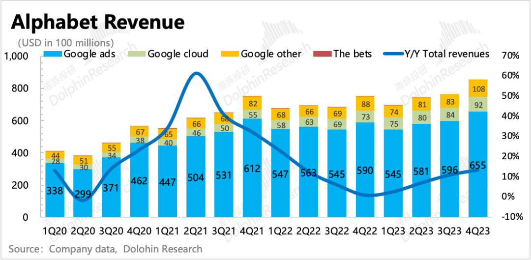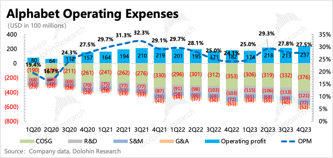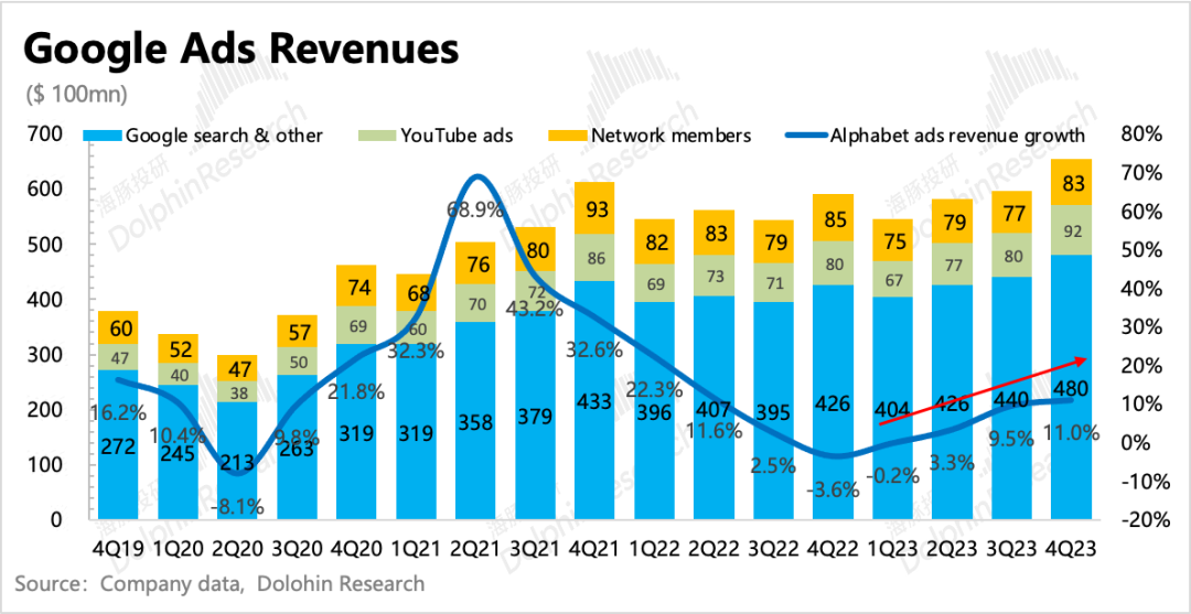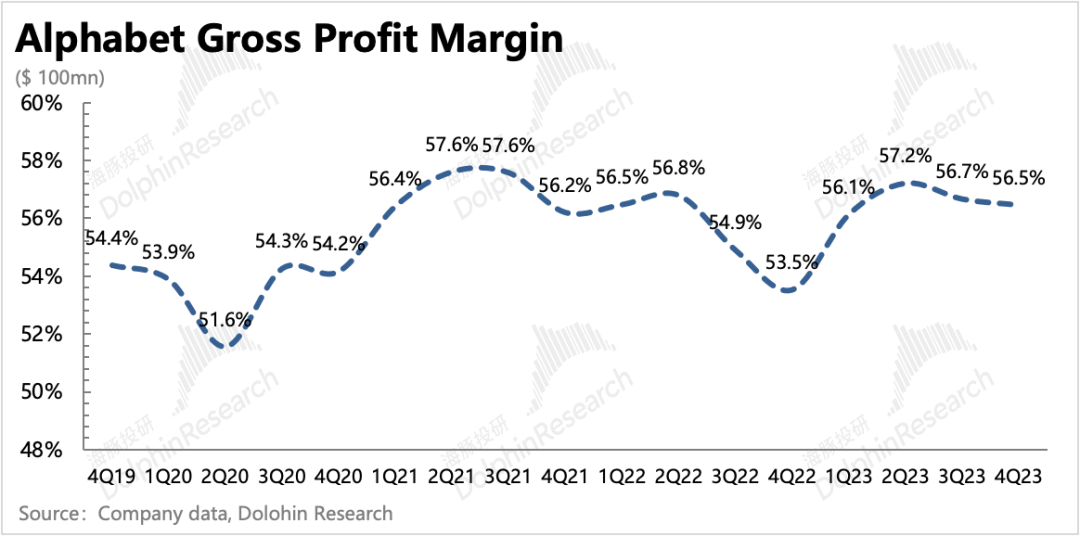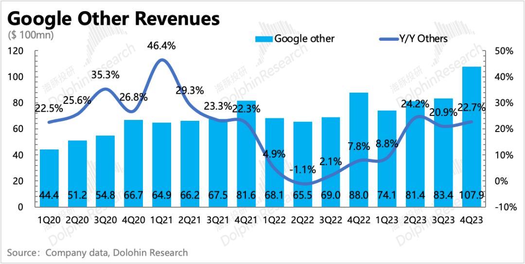 四季度其他业务收入再次表现优秀,增长加速。海豚君认为,可能和上季度一样,主要受益于YouTube订阅、Google one订阅以及Pixel手机销售。随着安卓端智能手机市场逐渐底部回暖,预计Google Play的收入后面也有会一定的增速支撑。