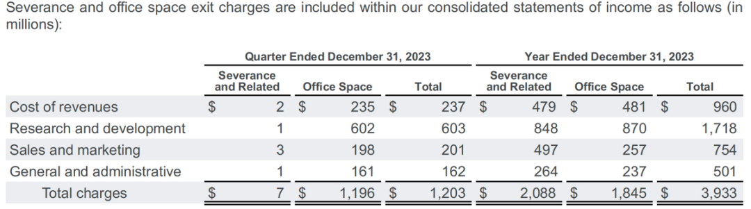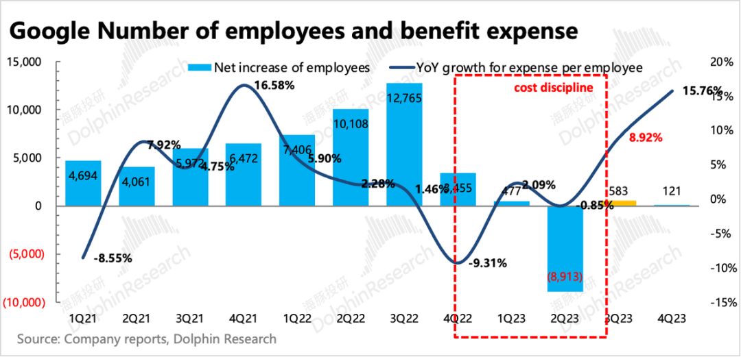 谷歌这一轮降本增效,主要就是两个措施。一个是裁员和减少办公室,年初宣布裁员1.2万人。另一个就是偏财技上的降本,延长服务器以及网络设备的折旧年限。同比来看,全年都会有利润改善。但环比来看,四季度员工人数净增减少的情况下,研发费用和员工股权激励都在同比加速增加,说明薪资占比更高的高端技术人才占比在提示。而今年开年,谷歌再次宣布裁员,虽然规模没有去年那么大,但也有几千人,预计一季度会有裁员、办公室资产处理的费用,共计7亿。2023年因为裁员和资产处理的费用,达到39亿。