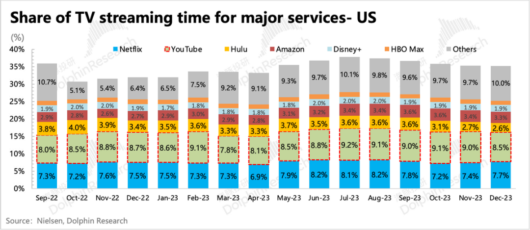 从递延收入来看,环比有一定走弱,并没有像往年四季度一样表现出旺季的情况,海豚君猜测,这可能与Q4 YouTube内容相对同行寡淡等有关。Nielsen数据也显示,YouTube在去年底,收视时长分额略有下滑。因此再加上2023年一季度基数较高,海豚君预计1Q24其他收入增长会有明显放缓。