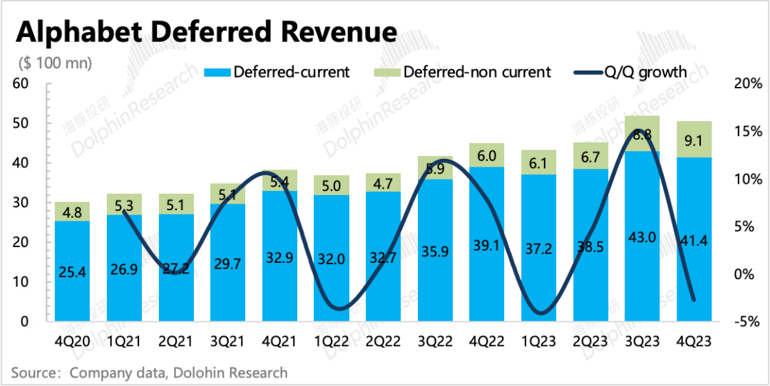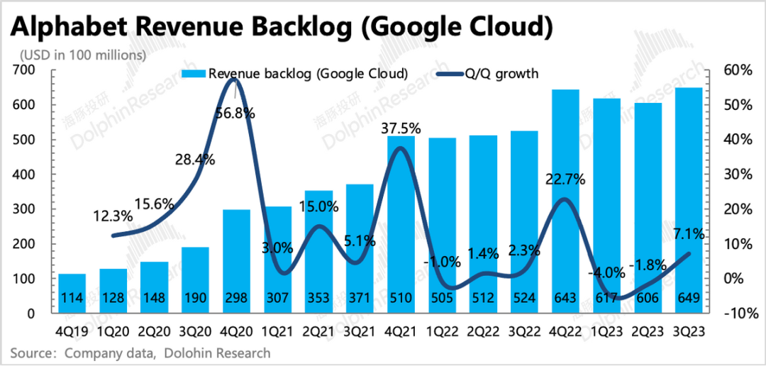 云业务是To B的,因此可能长期趋势上与本身的产品竞争力有关系,但短期的变化更容易受到当前或者上期新签合同规模的变动。因此海豚君一般还是会通过谷歌的Revenue Backlog指标来判断短期趋势。这个指标中大部分是来自云业务,因此它的变化趋势也可以视作云业务的未履约合同量的变化趋势。截至到三季度(四季度数据需要到SEC完整季报中查找),谷歌云的积压合同实际上还环比增加了7.1%,至少说明短期上不用太担心了。而今年前两个季度环比下滑,也正好对应着二、三季度的收入增速放缓。