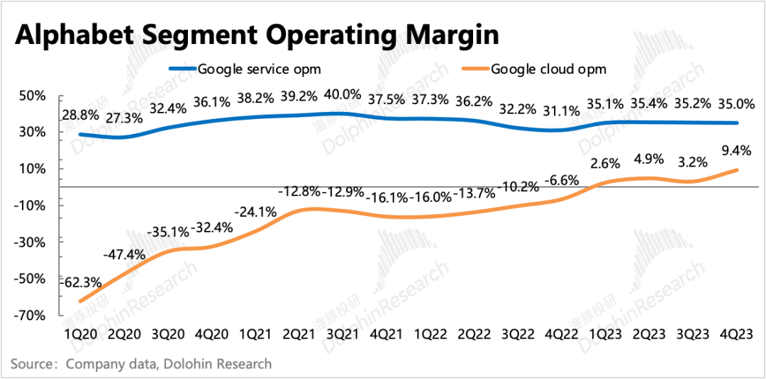 最终,虽然四季度高利润率的广告增长强劲,加速回暖,但集团整体的经营利润率环比并未提高,维持在27.5%。分业务层面看,以广告为主的谷歌服务经营利润率与三季度持平35%,云服务的经营利润率环比有一定的改善(4Q 9.4% vs 3Q 3.2%),也优于市场预期,只是云业务的利润和广告相比太小,因此对整体盈利能力的拉动效果不大。