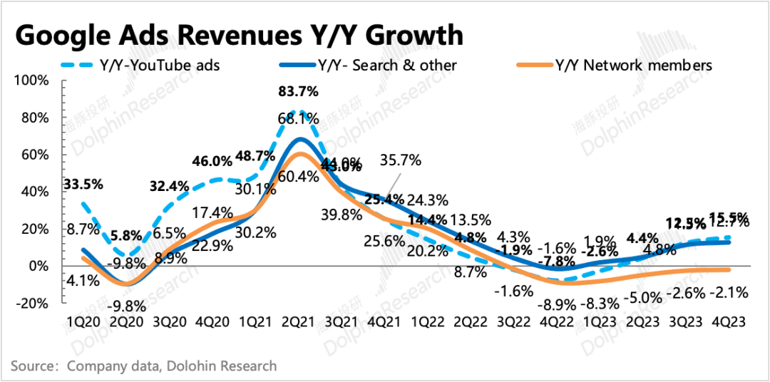 2023年一整年,广告市场都在走修复的周期。而下半年在电商混战的带动下,广告平台隔岸观火收获颇丰。因此作为广告一哥的谷歌,表现自然不会差。