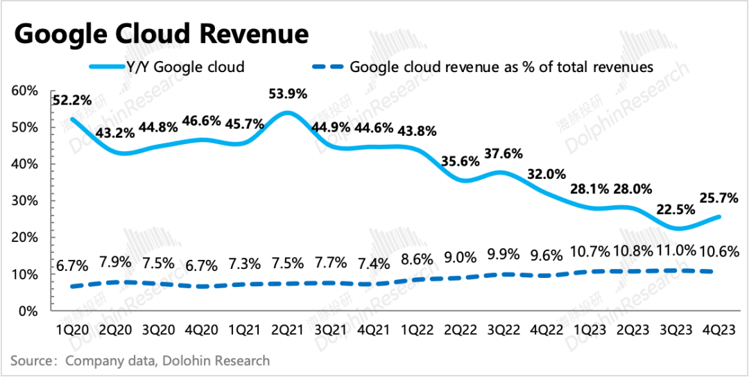 上季度谷歌云出了个“小雷”,在同行加速增长或增速触底的情况下,自己增速反而明显放缓。不过海豚君通过剩余合同额等指标变化情况,提及云业务无需担心,只是单季度的影响,大跌10%不至于,具体可看上期财报点评或YouTube视频《谷歌财报五问五答》。