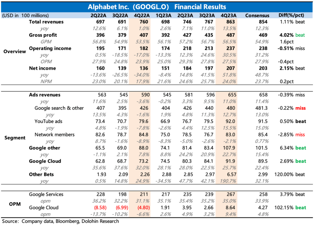 北京时间1月31日早晨,谷歌母公司Alphabet发布了2023年第四季度的财报: