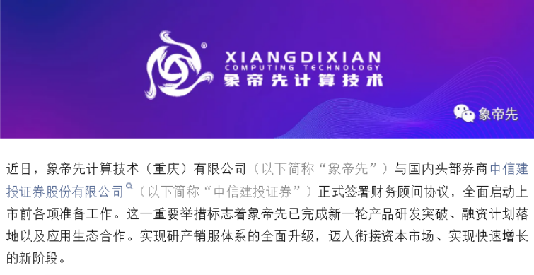 国产算力赛道传来重磅消息!近日,专注高性能通用GPU研发的象帝先官宣,已与中信建投证券签署财务顾问协议,全面启动上市筹备,同时核心产品天钧一号等GPU芯片顺利量产,实现“技术+产能+资本”三重跨越,为国产GPU突围注入新动能。