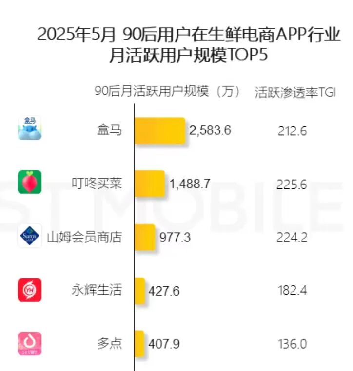 此前第三方数据显示,2025年5月,叮咚买菜平台的90后月活用户规模达到1488.7万,在生鲜电商App中仅次于盒马。