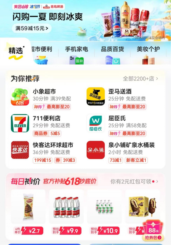 2018年,美团发布“美团闪购”品牌,进入到电商领域,为用户提供生鲜食品、商超日用、服装等外卖配送需求,先后与小米、vivo、奥克斯、华为、小天才等品牌达成战略合作;