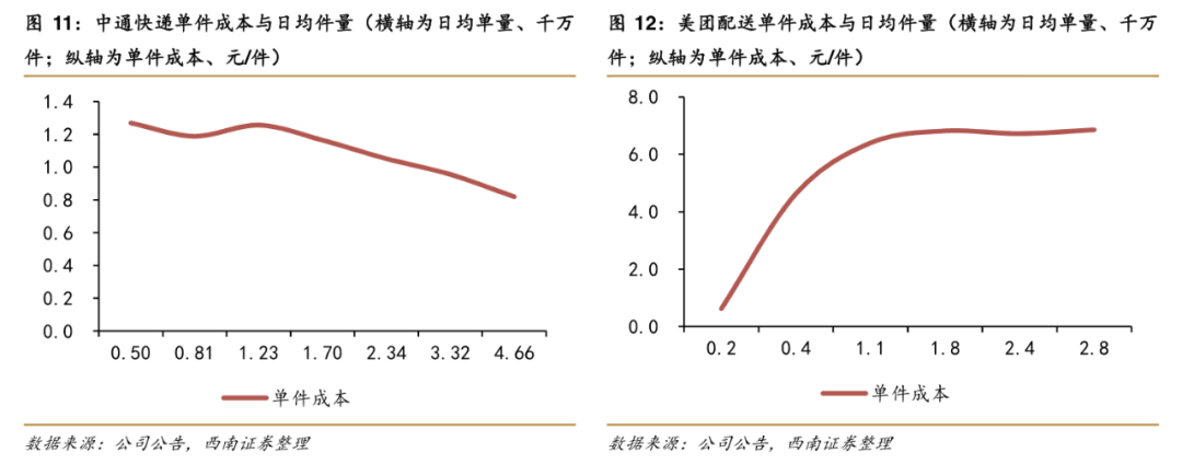 以美团外卖和中通为例,中通在日均单量从1000万/天爬升至4700万/天过程中,中转运输成本从1.2元/单下降至0.8元/单,降幅近50%;而美团外卖日均单量从1100万单/天增长到 2800万单/天的过程中,单件配送成本并未下降。